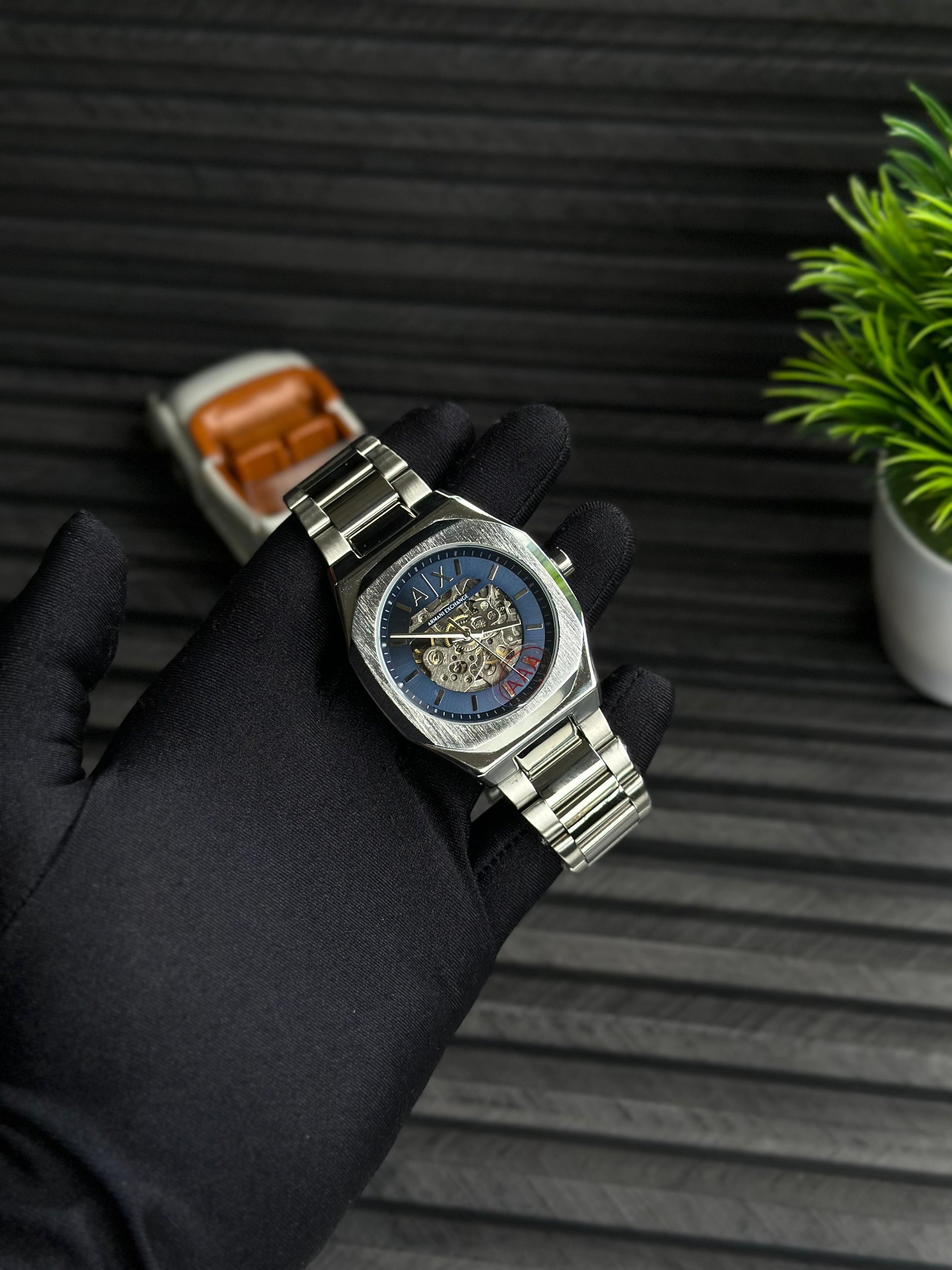 The watch, an Armani Exchange model, immediately captures attention with its dark grey case and a captivating blue face. Its design is elevated by the inclusion of an automatic movement, which is prominently displayed, offering a glimpse into the intricate mechanics of timekeeping. The watch is complemented by a sleek black wristband, and the entire piece is presented by a gloved hand, enhancing the sense of elegance.