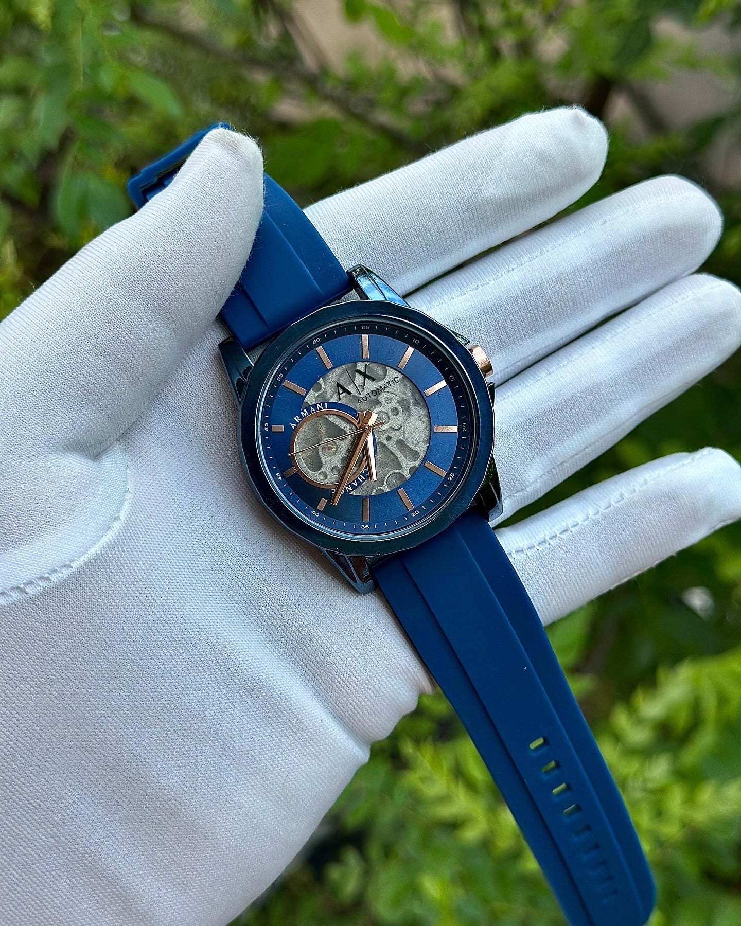 This Armani Exchange timepiece. It features a black silicone band, providing a sporty and modern aesthetic. The dial showcases a partially visible skeleton movement, which allows a glimpse into the intricate internal mechanisms of the watch. This design element adds a layer of sophistication and visual interest, highlighting the craftsmanship involved in the watch's construction. The silver case complements the black band, creating a balanced and stylish look. Overall, it's a contemporary watch that combines functionality with a bold design.