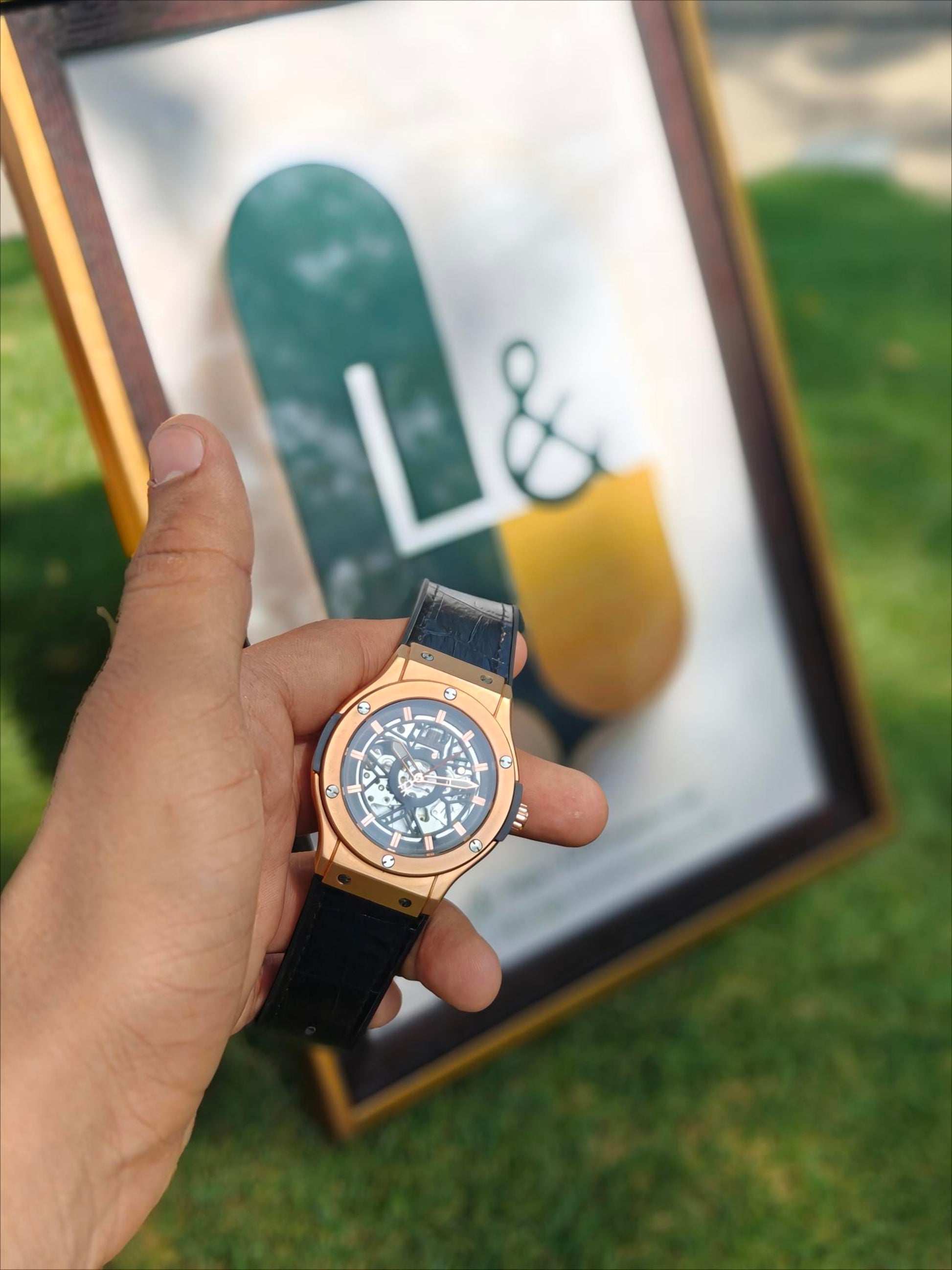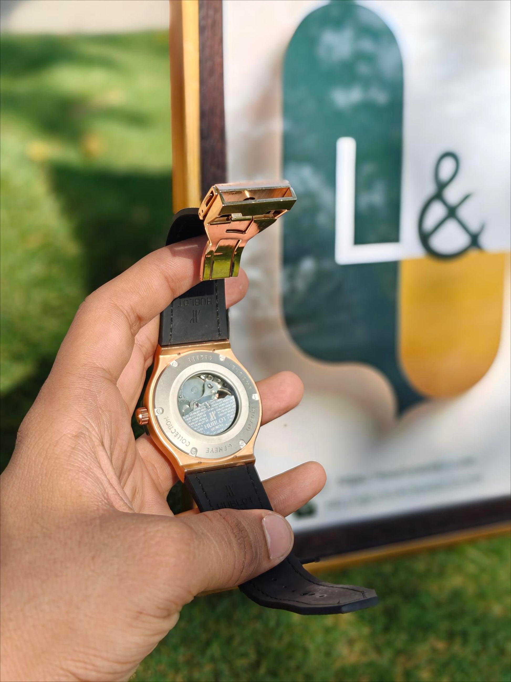 This luxurious timepiece features a bold rose gold-toned case paired with a black leather strap for a striking contrast. Its skeleton dial showcases the intricate mechanical movement beneath, offering a captivating view of the watch’s inner workings. The exposed gears and precise craftsmanship reflect both elegance and engineering excellence. Finished with visible screws on the bezel and a robust build, this watch is a perfect fusion of style, sophistication, and technical artistry.