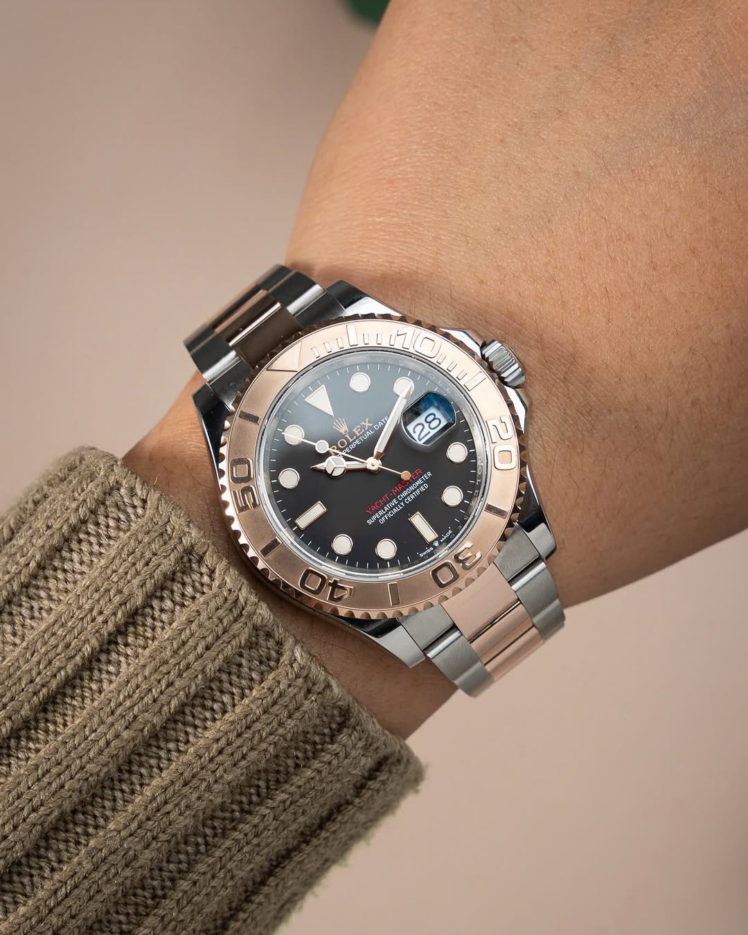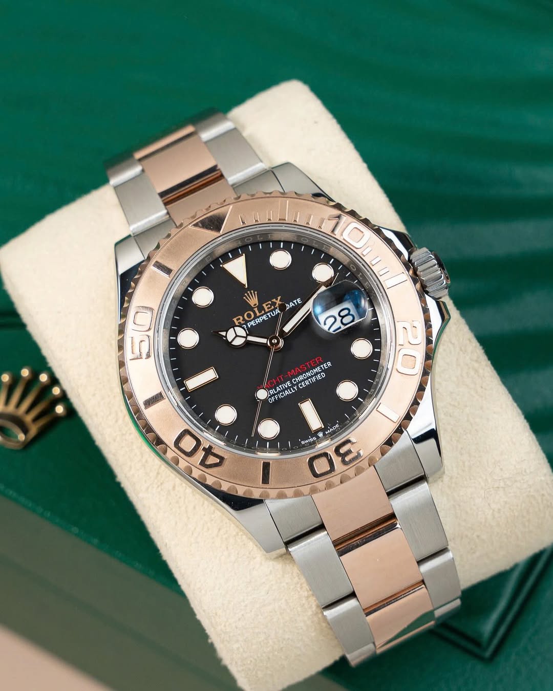 The Rolex Yacht-Master 40 is a watch that seamlessly blends luxury and functionality. The model in the image, with its black dial and a blend of rose gold and stainless steel, exudes asophisticated charm. The contrast between the dark dial and the precious metals creates a striking visual appeal, while the date display at the 3 o'clock position adds a practical touch. The watch's design is sporty yet refined, making it suitable for both casual and more formal settings. It's a true statement piece, embodying Rolex's commitment to quality and timeless design.