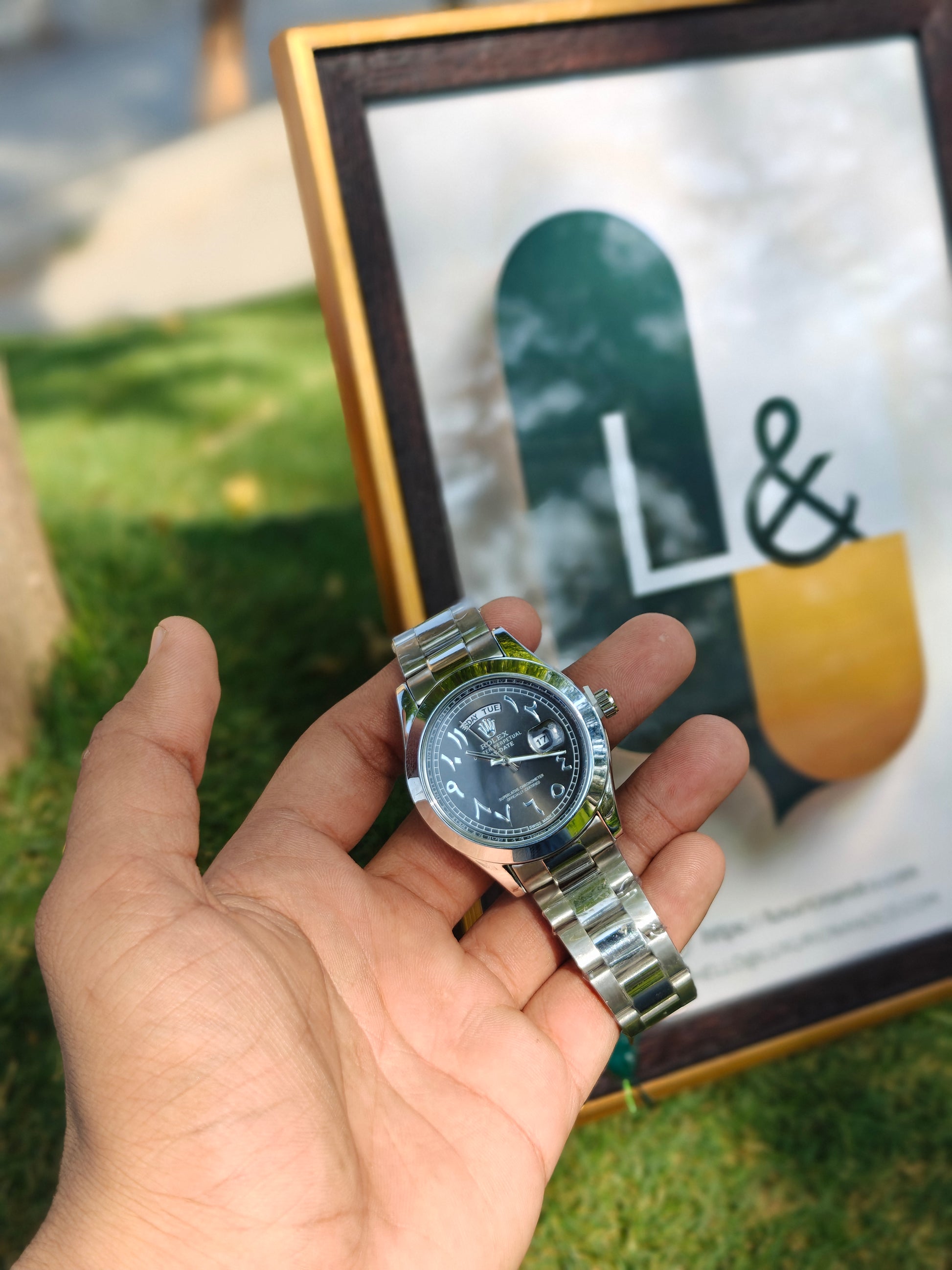 This Rolex Oyster Perpetual Day-Date timepiece is a statement of prestige and craftsmanship. Featuring a sleek black dial with unique Arabic numeral hour markers and a day-date window at the 12 and 3 o’clock positions, it embodies elegance and precision. The polished stainless steel case and bracelet enhance its refined look, while the signature Rolex fluted bezel adds a touch of timeless sophistication. Designed for those who value tradition and excellence, this watch is a perfect blend of luxury and functionality.