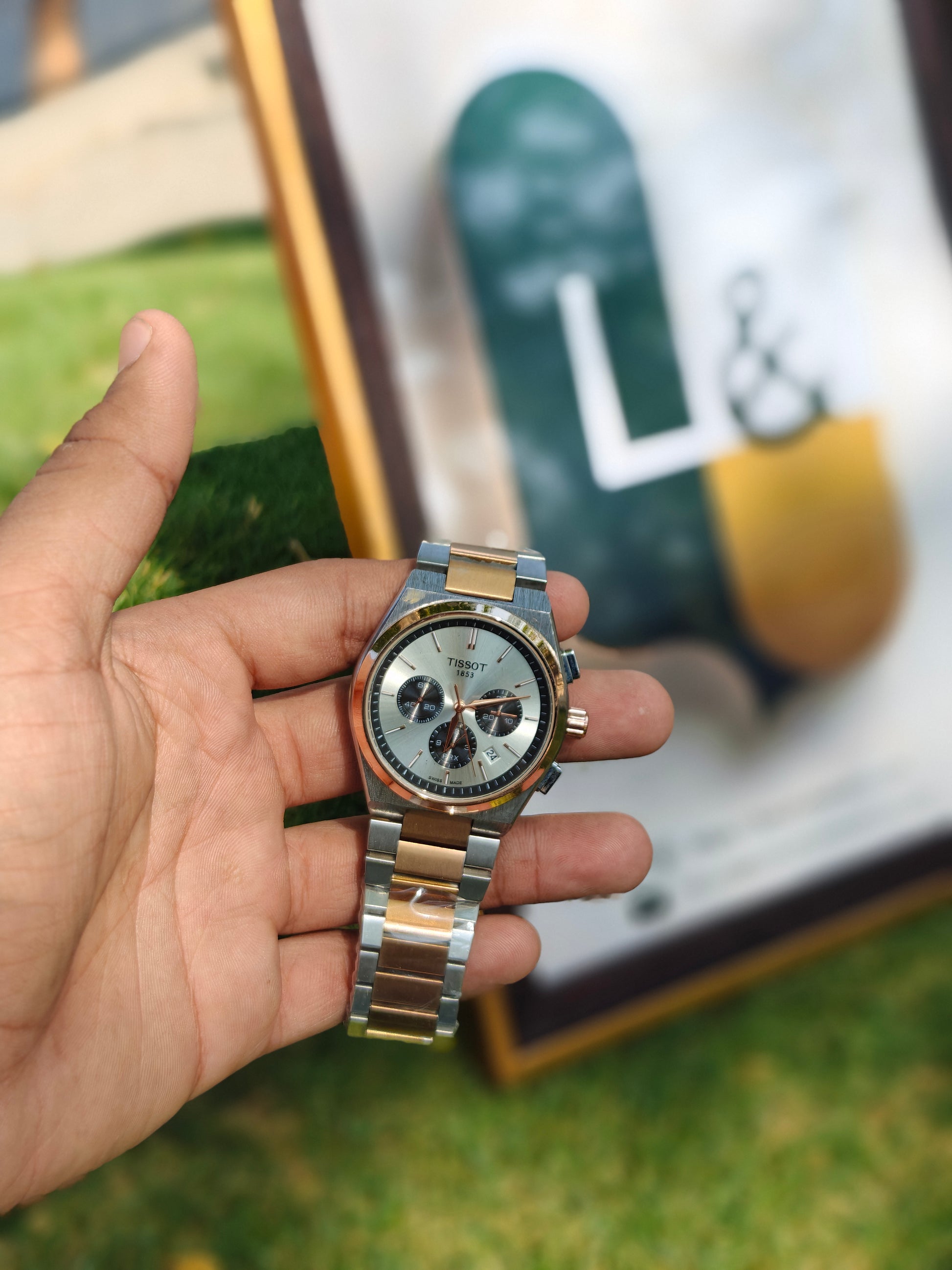 This elegant Tissot chronograph watch blends classic design with contemporary sophistication. Featuring a striking two-tone bracelet in silver and rose gold, it exudes timeless style. The silver dial is complemented by three sub-dials, a date window, and rose gold hands and hour markers, offering both functionality and refined aesthetics. Crafted with precision and attention to detail, this timepiece is a testament to Swiss watchmaking heritage and is perfect for those who appreciate luxury with a modern twist.